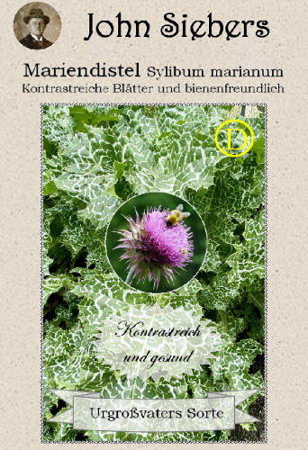 Die seit der Antike bekannte Mariendistel ist ein- bis zweijährig. Wuchshöhe 30 bis 150 cm. Die Blätter sind sehr dekorativ weiß marmoriert, glänzend, am Rand mit gelblich-weißen, bis 8 mm langen Dornen. Dekorative rosa Blüten, die bei Schmetterlingen und Bienen sehr begehrt sind. Heilwirkung für Lebererkrankungen, bei Schlangenbissen, als Gegengift bei Knollenblätterpilzen.