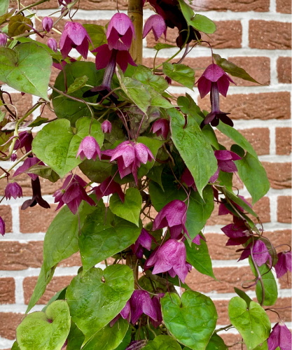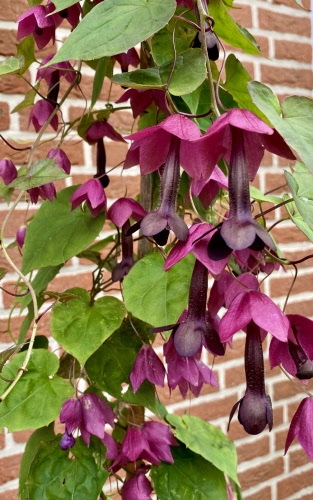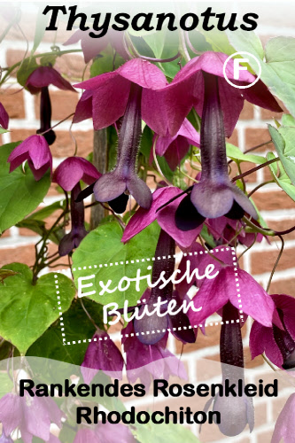 Rankendes Rosenkleid Rhodochiton atrosanguineus Purple BellsEine Kletterpflanze mit atemberaubenden, einzigartigen, dekorativen Blüten. Unzählige purpurfarbene kleine Glocken mit daraus herabhängenden schlanken dunkelvioletten Trompeten, die sich mit vier Flügeln unten weit öffnen. Kleine, dekorative Blätter. Nicht winterharte Kübelpflanze.