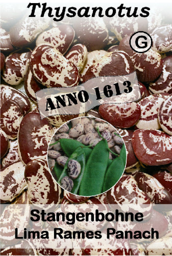 Eine historische Stangenbohne mit starker weinroter Maserung der Bohnenkerne und grünen kurzen und breiten Schoten. Kräftiger Bohnengeschmack. Geerntet werden die kurzen jungen Schoten als grüne Bohne, oder die ausgereiften zweifarbigen, dekorativen Kerne als delikate Kochbohne für Bohnensuppen oder leckere Salate. Bohnen nur gekocht verwenden.